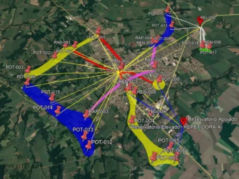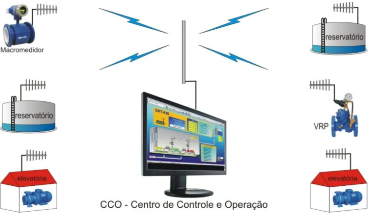 Do centro de operações é possível comandar de forma automática e manual o funcionamento de elevatórias, reservatórios, boosters, válvulas, comportas, macro medidores de vazão e qualquer outro dispositivo eletromecânico. Toda a comunicação se dá via rádio.
