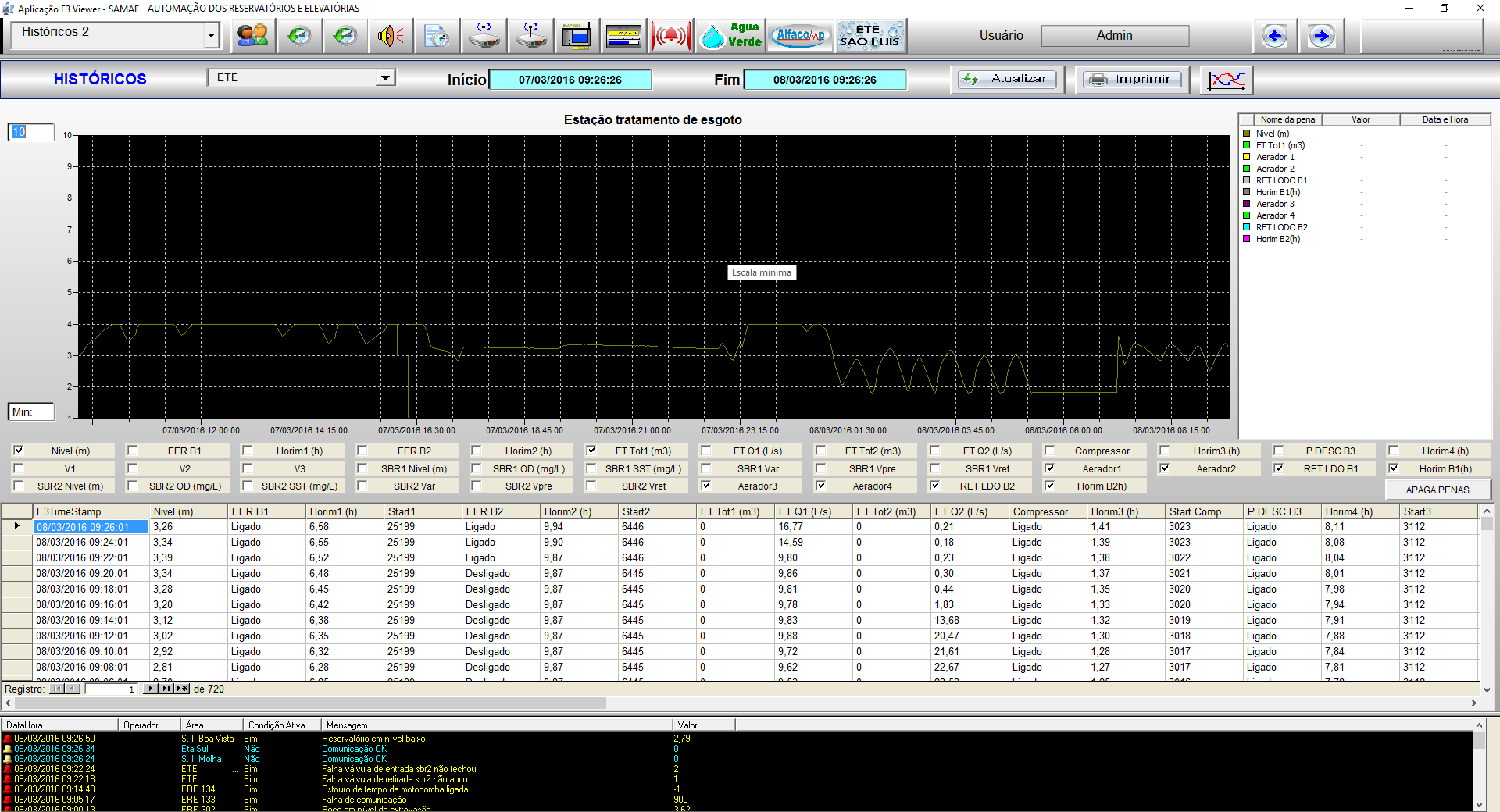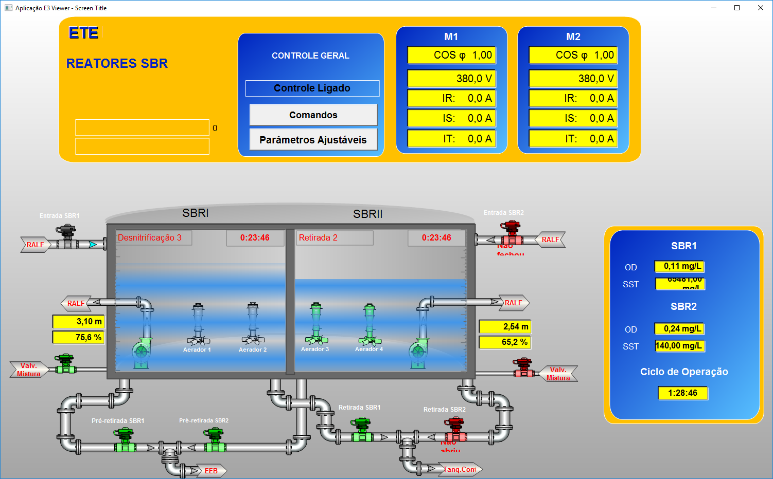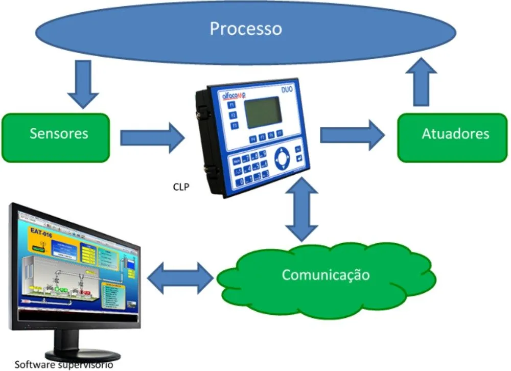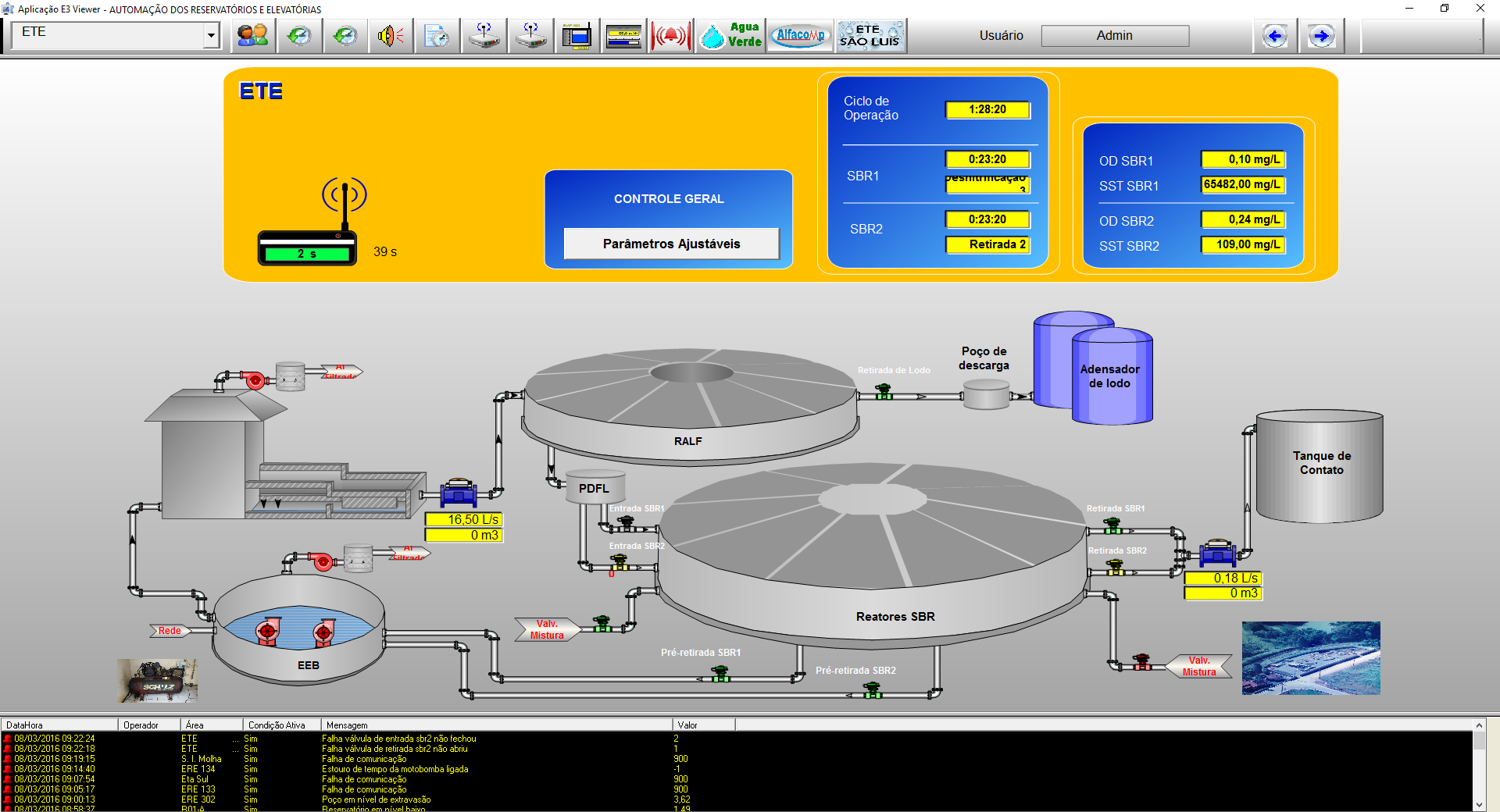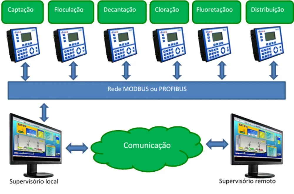 Nas estações de tratamento de água e de esgoto, ETAs e ETEs respectivamente, já há muito tempo está consagrada a aplicação das técnicas de automação industrial no controle e monitoração dos processos de tratamento. A forma mais popular de construção dos sistemas de automação dos processos de automação se dá pelo emprego de Controladores Lógicos Programáveis – CLPs – e softwares de supervisão industrial. Enquanto os CLPs realizam a aquisição dos dados de campo, como níveis, vazões e pressões, por exemplo, e acionam atuadores, tais como válvulas e motores, o software supervisório apresenta na forma de telas gráficas as leituras e estados dos parâmetros de processo, permitindo ao operador enxergar o processo e atuar sobre o mesmo.