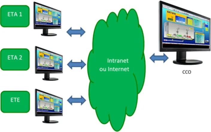 Além da monitoração local, dentro do ambiente da estação de tratamento de água ou esgoto, por intermédio de um computador rodando um software supervisório, a telemetria permite a supervisão e controle remoto de diversas ETAs e ETEs de um município ou até de diversos municípios em CCOs – Centros de Controle e Operação. Uma estrutura deste tipo permite que os diversos processos de tratamentos de água e esgoto de uma empresa de saneamento sejam rastreados, garantido a qualidade dos serviços prestados à população. Normalmente são utilizados os recursos de comunicação via Intranet e Internet em estruturas desse porte. No exemplo abaixo são utilizados um servidor de dados e um visualizador SCADA em cada estação de tratamento. No CCO são utilizados concentradores de comunicação que recebem os dados de todas as estações e disponibilizam a visualização e registro histórico de todos os parâmetros de interesse.