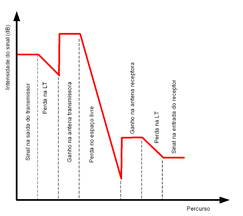 Desde a saída do transmissor até a chegada no receptor, o sinal sofre atenuações e ganhos. O gráfico ao lado representa a variação da intensidade do sinal ao longo do percurso. A intensidade do sinal sofre as seguintes alterações: