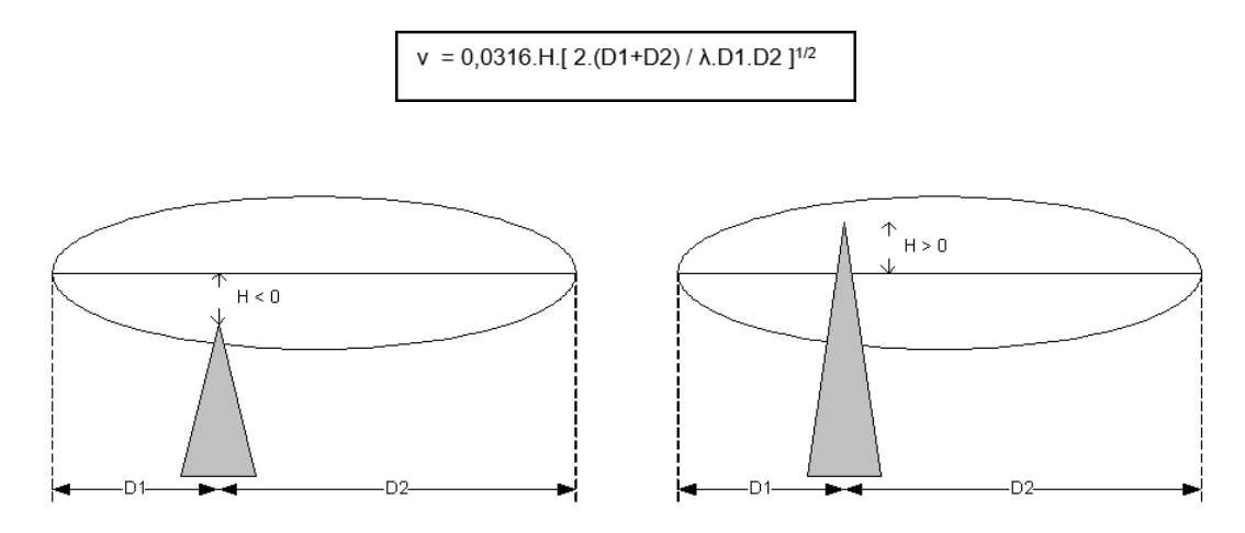 Onde v é o índice de liberação do raio de Fresnel dado por: