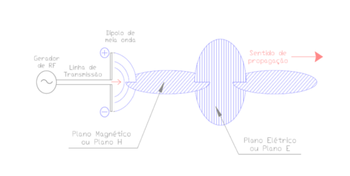 A figura a seguir apresenta a irradiação resultante de um dipolo simples polarizado verticalmente. Em polarização vertical, o plano elétrico é perpendicular à superfície da Terra, enquanto o plano magnético é paralelo à superfície da Terra.