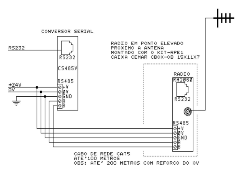 O rádio modem pode também ser instalado junto à antena omni no ponto mais elevado do prédio do CCO. Nessa condição, o rádio será conectado ao painel via cabo de rede CAT5. O cabo irá conduzir a alimentação e a comunicação. A comunicação entre o rádio e o painel se dará em RS485. Este cabo pode ter até 100 metros de comprimento sem necessidade de condutores adicionais.