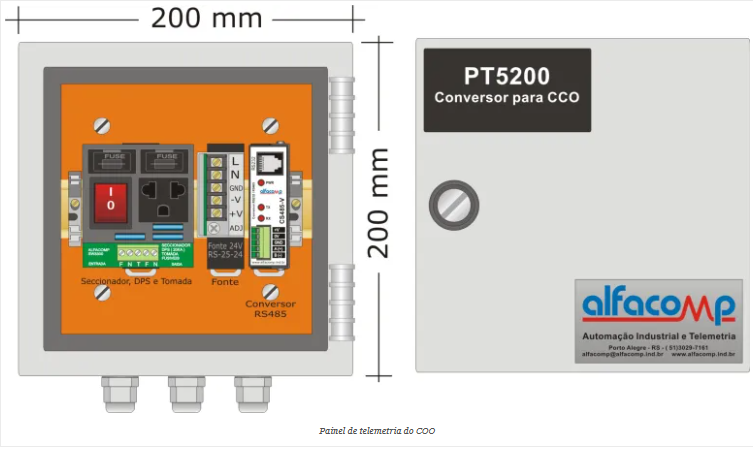 O painel abriga uma fonte de alimentação e um conversor serial RS232/RS485. A utilização principal para a qual a solução foi concebida, é a interligação do computador ao um rádio modem. O rádio modem estará instalado próximo à antena, utilizando-se o KIT RPE, e será alimentado pela fonte de alimentação do painel PT5200.