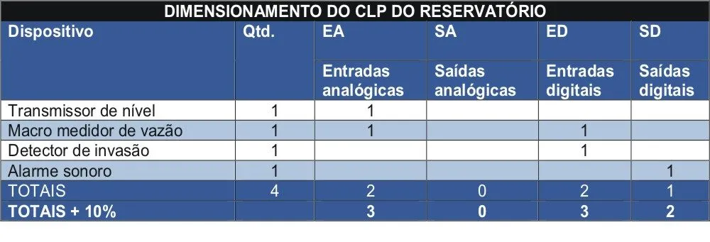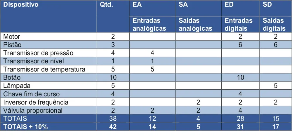 Uma das etapas na definição de um sistema de automação é o dimensionamento do CLP. Para tanto, devemos relacionar os dispositivos envolvidos no sistema e listar para cada um o número de entradas e saídas analógicas e digitais necessárias para o comando e monitoração.