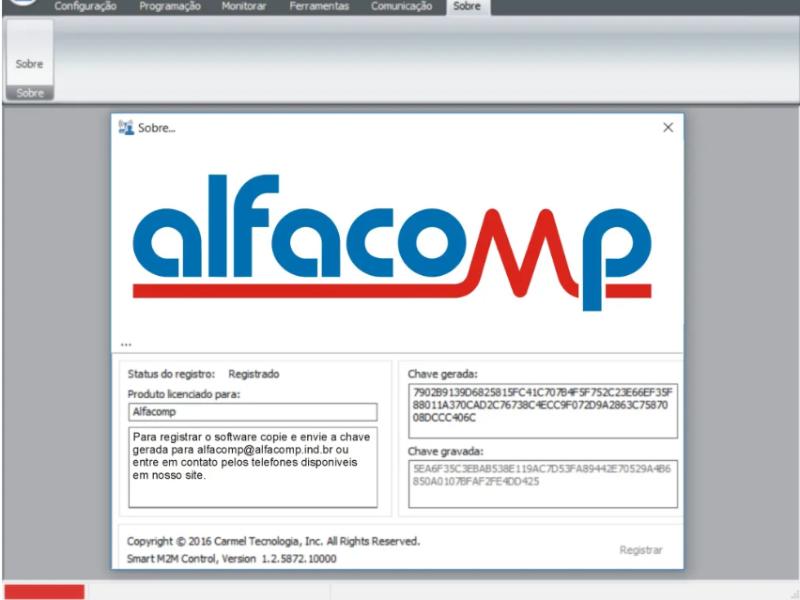 O Smart M2M Control possui o uso controlado através de licença de uso. Esta licença pode ser verificada na aba “Sobre” do software. Para ativar o software é preciso enviar a Chave gerada (após instalação) para www.alfacomp.net ou entrar em contato através dos telefones disponíveis em nosso site. Você receberá a Chave gravada. Insira em seu respectivo campo e clique em Registrar. Após este procedimento o seu Smart M2M Control estará pronto para ser utilizado.