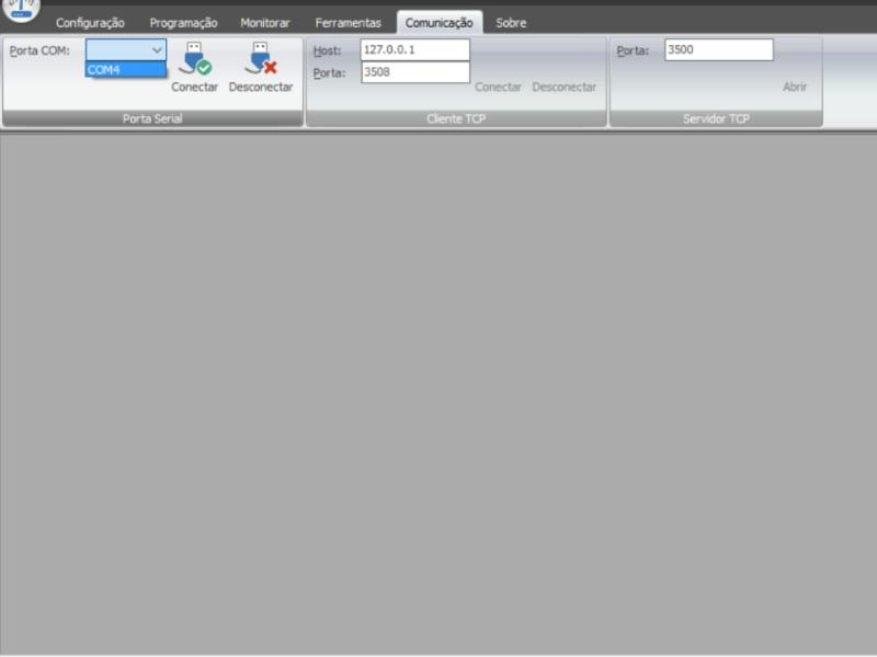 Para estabelecer conexão entre PC e data logger, vá até a aba “Comunicação” do software Smart M2M Control, selecione a porta COM atribuída ao data logger pelo sistema, e clique em Conectar. Se o seu data logger está na rede TCP, utilize os campos host e Porta para se conectar remotamente.