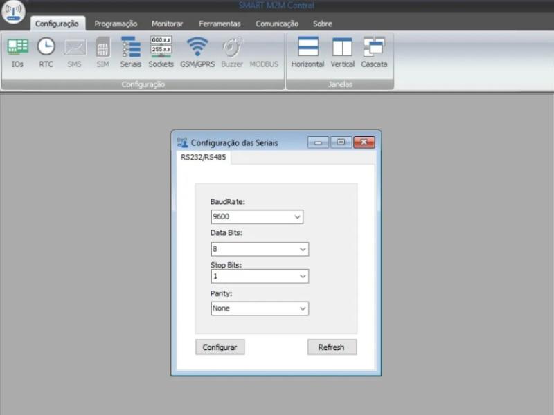 Interface para configurar as portas seriais do DL2016. Por padrão, a comunicação serial é 9600bps, 8 bits de dados, 1 stop bit e sem paridade.