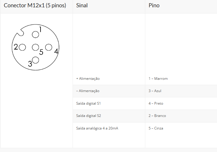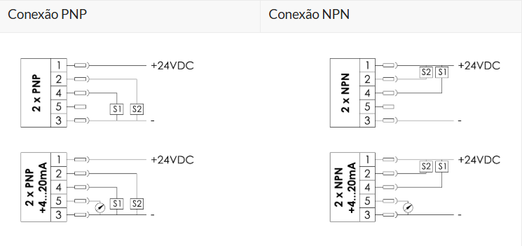 Sinais de saída digital (S1 e S2) | PNP e NPN, normalmente aberto (NO) ou normalmente fechado (NC) |