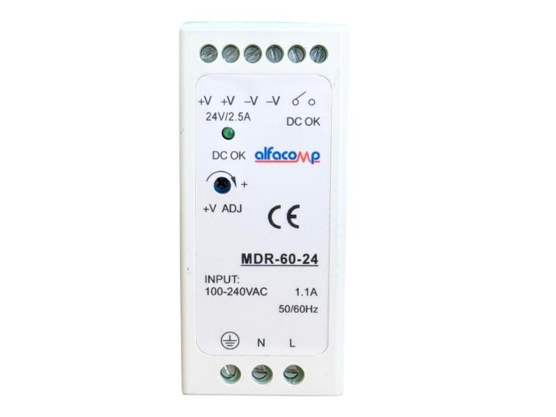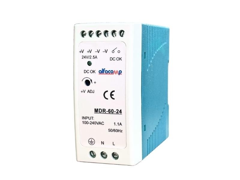A MDR-60-24 é uma Fonte Chaveada Industrial Alfacomp e foi desenvolvida para aplicações de automação em ambiente industrial, tais como a construção de máquinas, controle de processos, automação predial e construção naval, entre outros. Possui proteção contra curto-circuito e sobrecargas de corrente e tensão. O projeto eletrônico garante alta eficiência, longa vida útil e alta confiabilidade.
