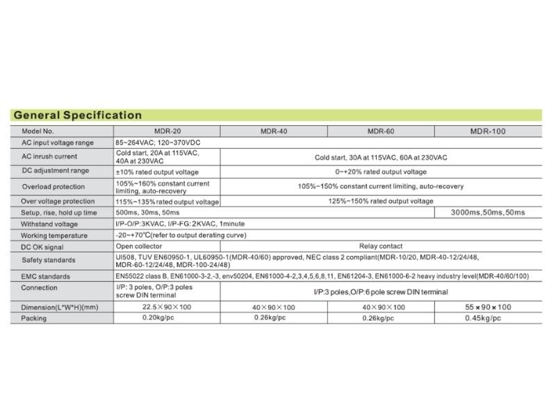 A fonte chaveada MDR-60-24foi desenvolvida para aplicações de automação em ambiente industrial, tais como a construção de máquinas, controle de processos, automação predial e construção naval, entre outros. Possui proteção contra curto-circuito e sobrecargas de corrente e tensão. O projeto eletrônico garante alta eficiência, longa vida útil e alta confiabilidade. A saída pode ser ajustada em até 10% da tensão nominal.