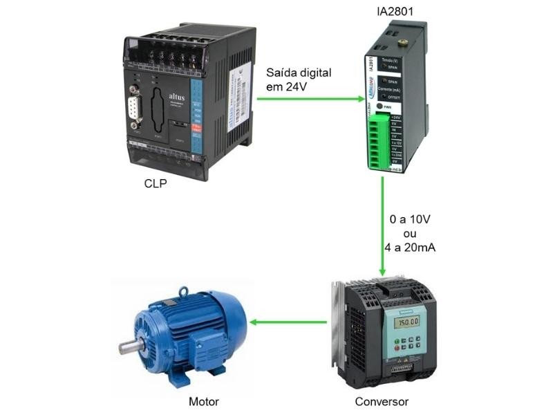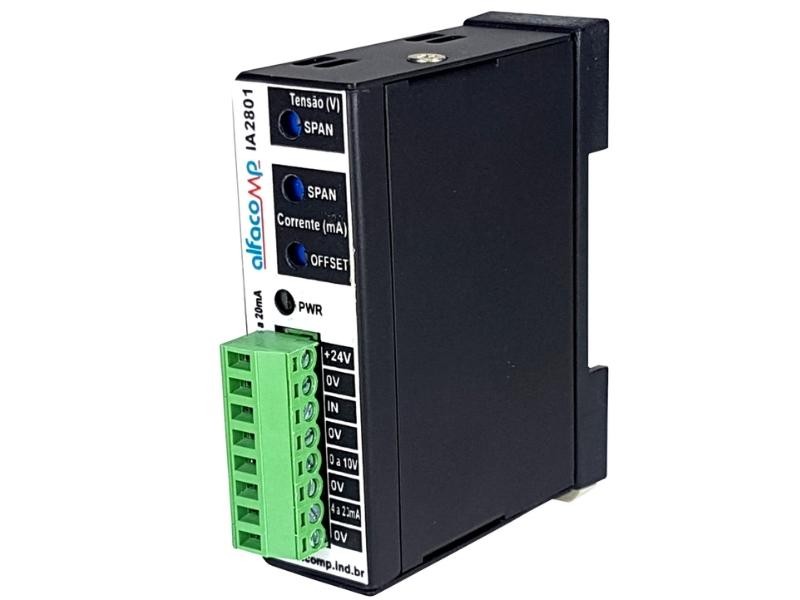 O conversor analógico IA2801 consiste em uma solução de alto desempenho e baixo custo para conversão de pulsos de uma saída digital de CLP para sinal analógico de tensão e corrente. De formato adequado para montagem em painéis elétricos de automação industrial, é alojado em gabinete metálico para encaixe em trilho DIN.