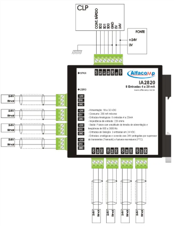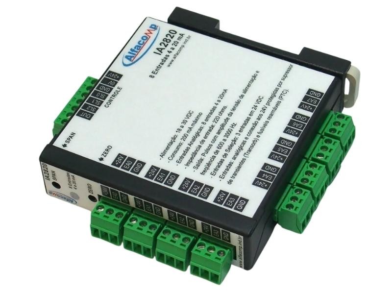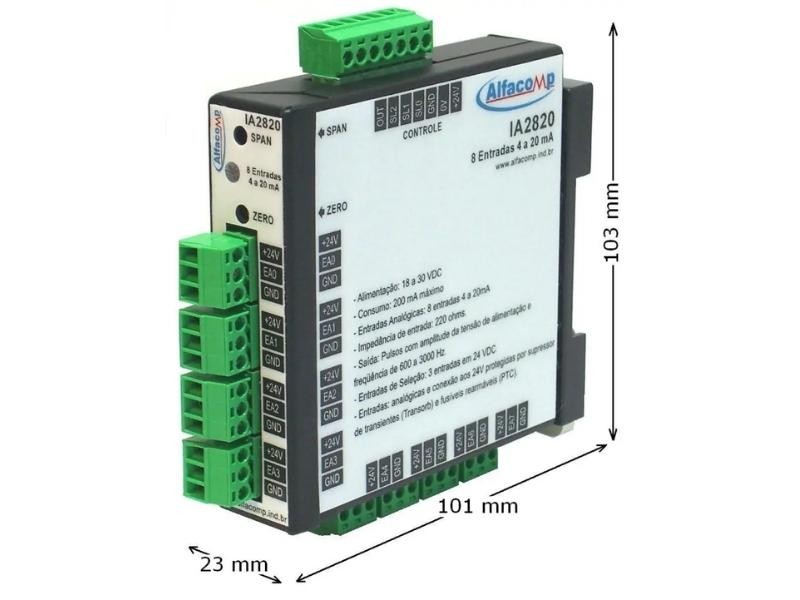 O conversor analógico IA2820 constitui um conversor multiplexado de sinais. Tem a capacidade de converter até 8 sinais analógicos de corrente de 4 a 20mA gerando uma saída em pulsos, de frequência proporcional à entrada selecionada. Sua utilização destina-se às configurações de CLP que possuem entrada de contagem rápida, viabilizando aquisição de até 8 sinais analógicos por módulo IA2820 a um preço extremamente competitivo. Para cada entrada analógica, o módulo é dotado de conexão destacável com: 24V, Sinal e GND. Dessa forma, o módulo funciona também como borneira economizando espaço e tempo de montagem.