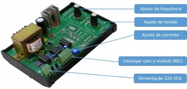 Ajuste de Tensão | Permite ajustar a largura dos pulsos da onda quadrada de 0 a 100% de largura. 0% corresponde a uma tensão RMS igual a zero e 100% corresponde a uma tensão RMS de aproximadamente 280 V na saída do módulo de potência. |