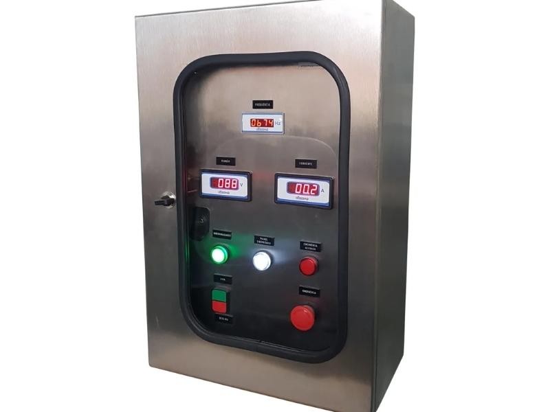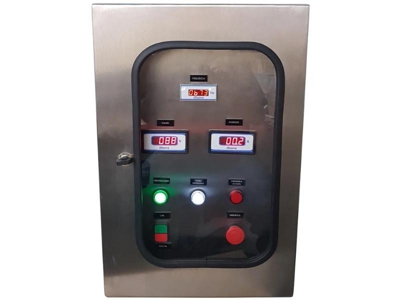 Acionamento | Botão LIGA no painel e bornes para conexão de botão remoto. Botão EMERGÊNCIA no painel e bornes para conexão de botão remoto |