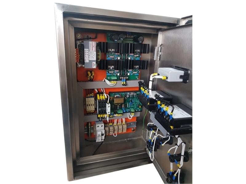 O sinal elétrico é obtido pela retificação da energia elétrica da rede obtendo-se, assim, tensão contínua que então é novamente transformada em tensão alternada pela utilização de circuito de chaveamento dotado de transistores de efeito de campo de potência.