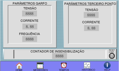Ao selecionar a tela de históricos você terá acesso ao registro de todas as variáveis utilizadas para cada insensibilização, toda vez que o garfo é acionado você tem o registro de corrente do garfo, corrente no terceiro ponto, tensão do garfo, tensão do terceiro ponto, frequência, tempos selecionados, data e hora.