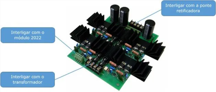Este módulo consiste em um inversor em ponte utilizando transistores FET. O módulo incorpora ainda os capacitores de filtragem da tensão retificada pela ponte retificadora SKB25/4. Este módulo transforma a tensão DC de 331 V em uma tensão alternada de formato quadrado e frequência e largura de pulsos comandados pelo módulo 2022.