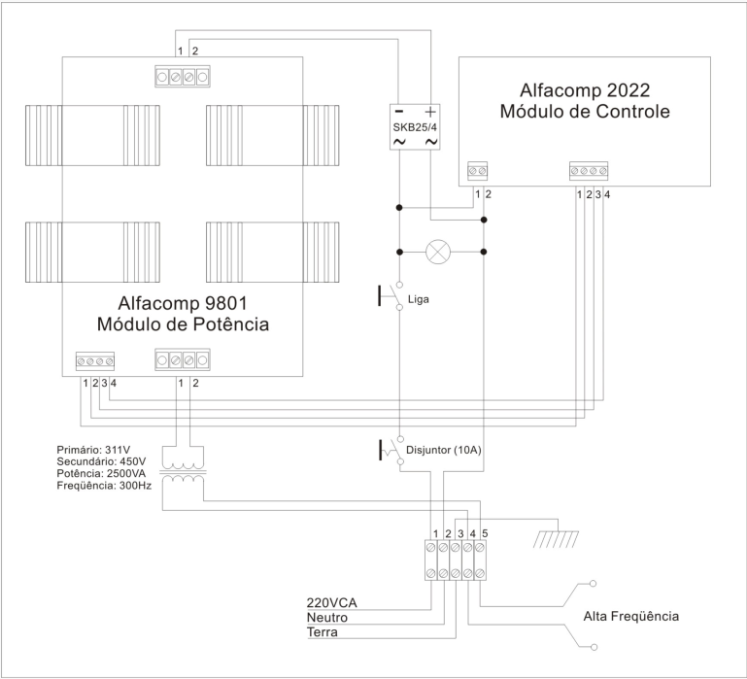 A figura a seguir apresenta a um esquemático básico para a montagem de um insensibilizador de suínos utilizando os módulos 2022 e 9801.