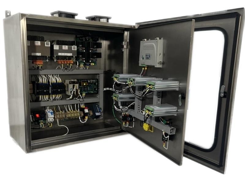 O insensibilizador IE2002 utiliza os módulos Alfacomp 2022 e 9801, consagrados pelo mercado como a eletrônica mais utilizada na insensibilização de suínos. Um CLP com IHM controlam o sequenciamento do funcionamento do equipamento.