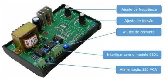 Além disso, monitora a corrente fornecida pelo módulo de potência, diminuindo a largura dos pulsos de chaveamento, de maneira a limitar a energia fornecida.