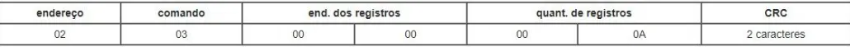Exemplo-1: Se o PLC precisa ler as 10 primeiras entradas analógicas (do endereço 0000 ao 0009) no módulo 2. Para isso é preciso utilizar o comando de leitura de múltiplos registros analógicos (comando 3). O frame de comunicação utilizado é mostrado abaixo (os endereços são mostrados em sistema hexadecimal):