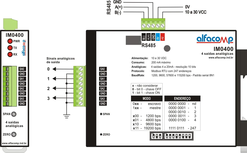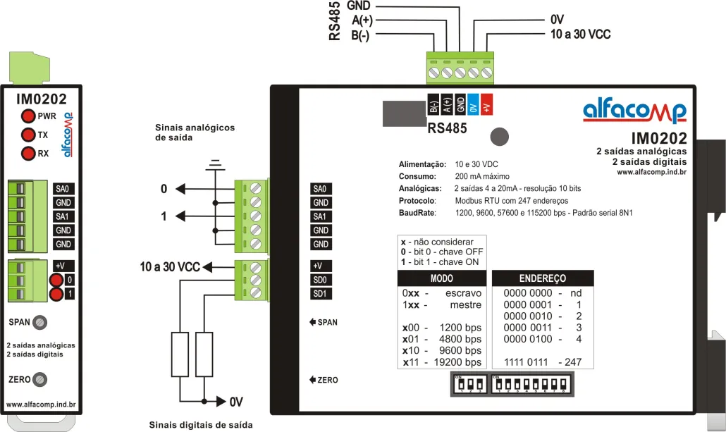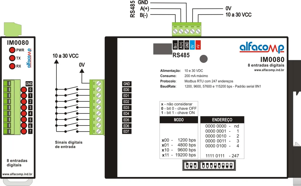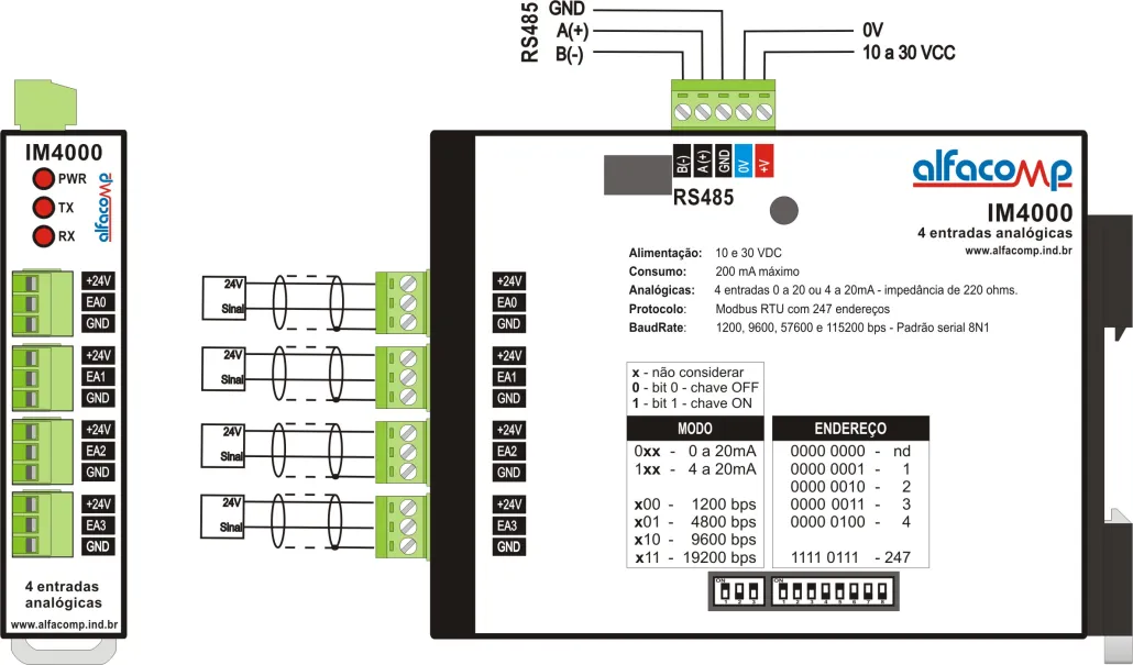 Protocolo: MODBUS RTU — mestre e escravo (IM0400, IM0008 e IM0202) escravo (IM4000, IM0080 e IM2020)