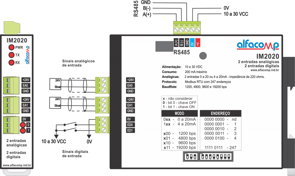 Interface Modbus com 2 entradas analógicas e 2 entradas digitais – IM2020