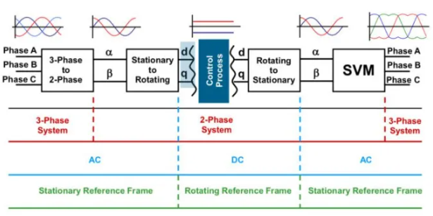A corrente do estator em um motor CA é composta por dois componentes: o componente magnetizador (d) da corrente e o componente produtor de torque (q). Com FOC, esses dois componentes de corrente são controlados independentemente (cada um com seu próprio controlador PI). Isso permite que o componente produtor de torque, q, seja mantido ortogonal ao fluxo do rotor para produção máxima de torque e, portanto, controle de velocidade ideal.