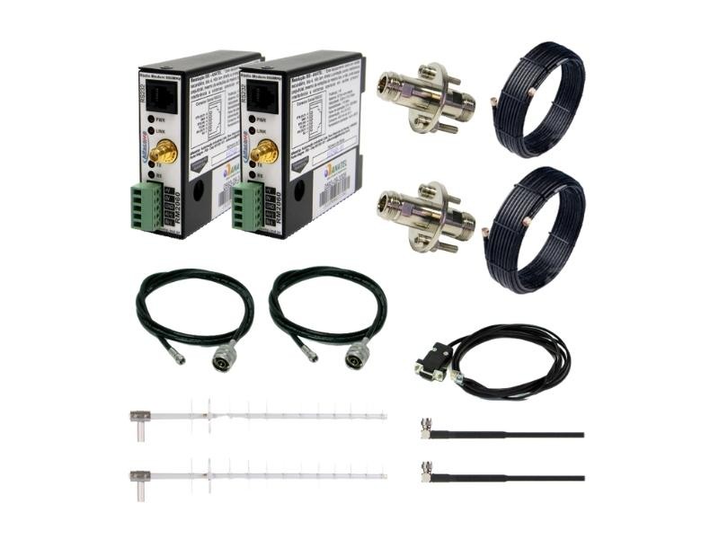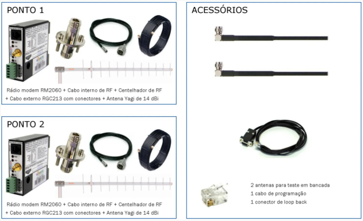 O KIT RÁDIO ENLACE 1 reúne os equipamento e materiais necessários para estabelecer a comunicação serial entre dois pontos. O padrão de comunicação pode ser em RS232 ou RS485. A velocidade serial admitida é de 1.200 a 115.200 bps. O alcance do enlace é de até 30 km com visada. Exemplo de aplicação: comunicação entre CLPs.