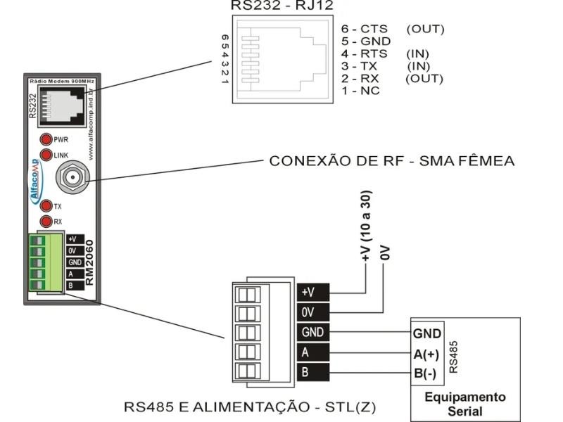 O RM2060 incorpora as interfaces seriais RS232 e RS485 e permite comunicação simultânea pelas duas portas. O rádio pode agora ser instalado junto à antena e alimentado pelo cabo do RS485 ficando até 100 metros distante do CLP ou micro.
