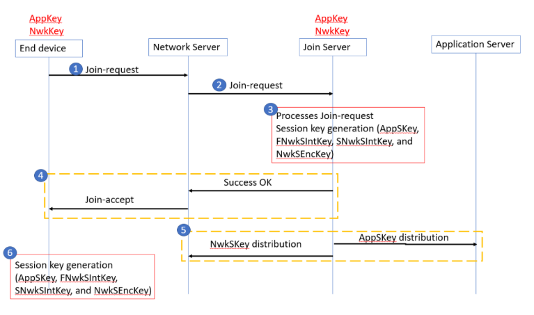 O servidor de adesão processa a mensagem de solicitação de ingresso. O servidor de adesão gerará todas as chaves de sessão (AppSKey, FNwkSIntKey, SNwkSIntKey e NwkSEncKey) se o dispositivo final tiver permissão para ingressar na rede.