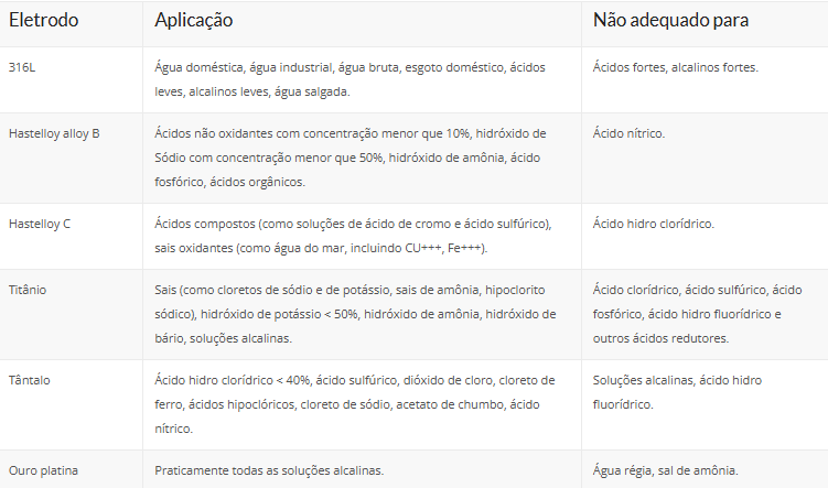 Material do eletrodo: 316L, Pt, Ta, Ti, HB, HC, WC
