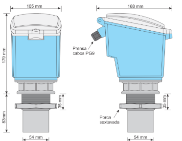 O nível é finalmente convertido em sinal 4 a 20mA, sendo o valor de 4mA indicador do nível mínimo e o 20mA indicador do nível máximo.
