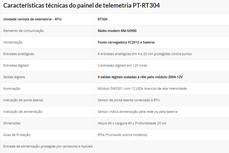 O painel de telemetria PT-RT304 é baseada na remota de telemetria RT304. Os quadros apresentam alto índice de integração, modularidade, facilidade de manutenção, remota com protocolo MODBUS RTU, resultando em montagens de alto desempenho e baixo custo.