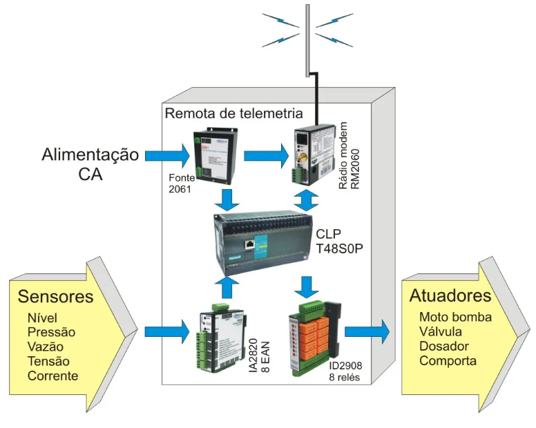 A figura a seguir mostra o bloco diagrama da remota de telemetria utilizada na automação da estação elevatória: