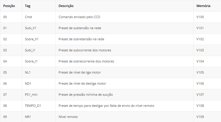 Para controlar o funcionamento da estação elevatória, o CLP local monitora os seguintes parâmetros locais e remotos: