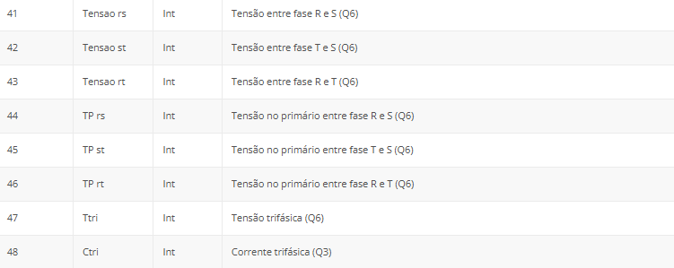 São os seguintes os parâmetros básicos de leitura Modbus do multimedidor, utilizando a função 0x04 (read input registers).