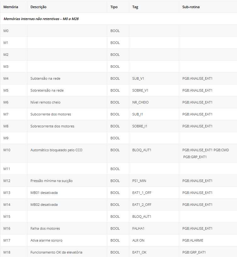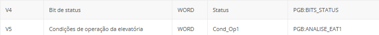 A memória Cond_Op1 contém 16 bits que são utilizados como status de funcionamento da estação, cada bit identifica uma ocorrência, sendo 0=false e 1=true.