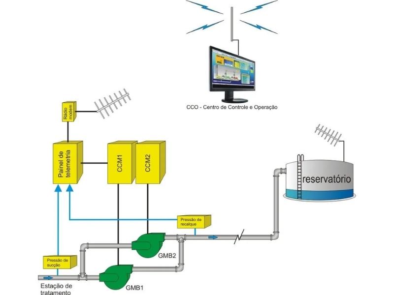 A informação de nível de cada reservatório é repassada à sua respectiva estação elevatória pelo sistema da comunicação via rádio, centralizado no CCO.