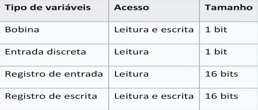 A tabela a seguir apresenta as variáveis fornecidas por um dispositivo escravo para um dispositivo mestre.