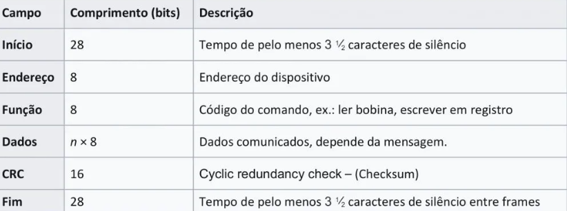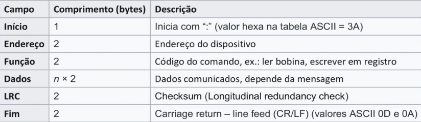 Endereço, função, dados e LRC são todos pares de caracteres ASCII que representam valores hexadecimais. Por exemplo, o valor 122 (7 x 16 + 10) será representado por “7A”.
