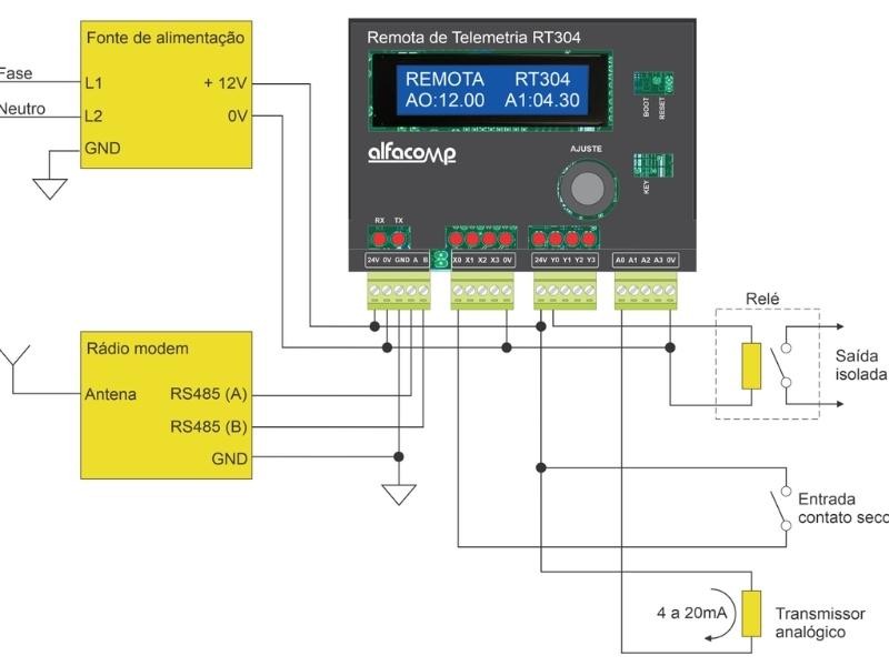 Porta serial escrava RS485: Esta porta permite a comunicação em MODBUS RTU em 9600 bps 8 bits de dados e sem paridade. O exemplo mostra o módulo RT304 ligado a um rádio modem.