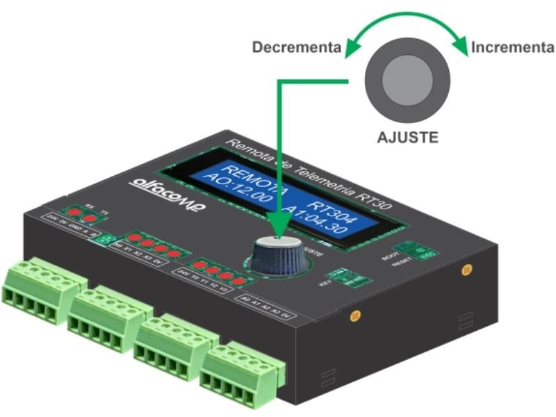 O botão de ajuste é um encoder rotativo que possibilita o incremento ou decremento de variáveis, além de permitir a rolagem das linhas do display. Além disso, o botão de ajuste funciona como uma chave de pressão (push button), permitindo alternar entre os modos de operação do display, confirmar os valores ajustados e avançar para o próximo campo a ser modificado.