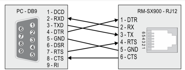 O transceptor RM-SX900 é chamado DCE (Data Communication Equipment). Um DCE pode ser conectado a um DTE (Data Terminal Equipment), por exemplo, um PC, através de um cabo serial cuja configuração é apresentada abaixo.