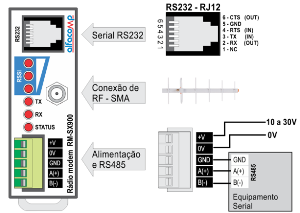 RF: SMA fêmea; Serial RS232: RJ12 macho; Serial RS485: Borne destacável modelo STL(Z) – Juntamente com a alimentação |