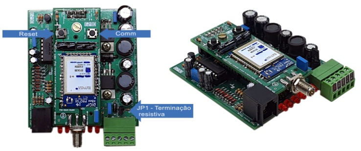 Construção internaO equipamento é composto por duas placas eletrônicas como mostrado abaixo. A figura apresenta a localização do jumper da conexão resistiva e dos botões de RESET e COMM.