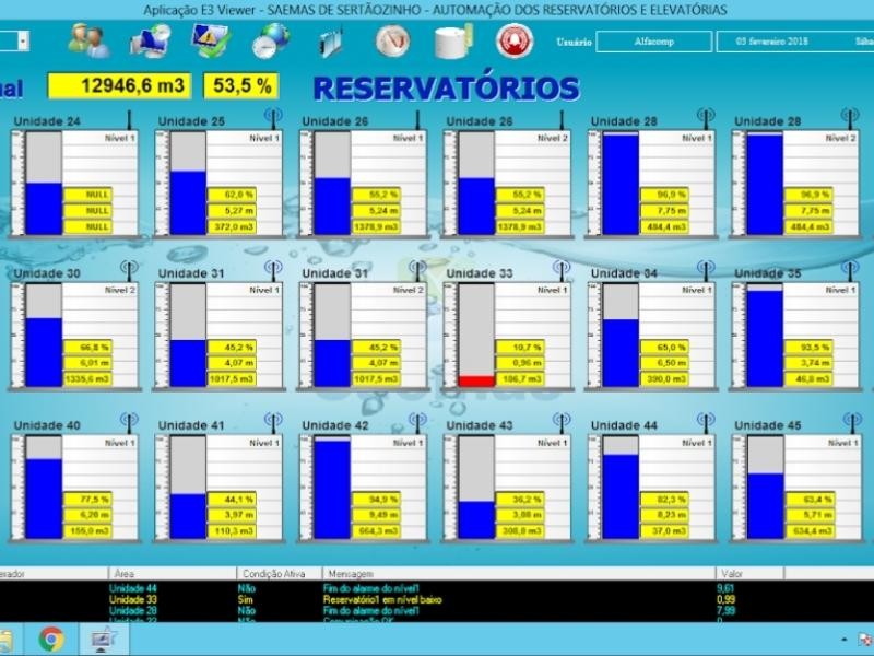 O E3 exibe ainda os níveis e volumes de água verificados no total e junto a cada reservatório, permitindo acessar as configurações padrões ajustáveis da altura da água em cada reservatório. As vazões mensuradas nas moto bombas localizadas entre os poços e reservatórios, tanto a total quanto a calculada por hora, também são monitoradas, assim como o tempo de varredura do sistema de automação em cada unidade.