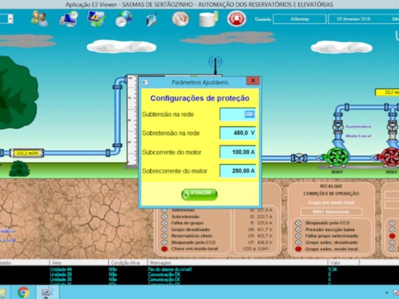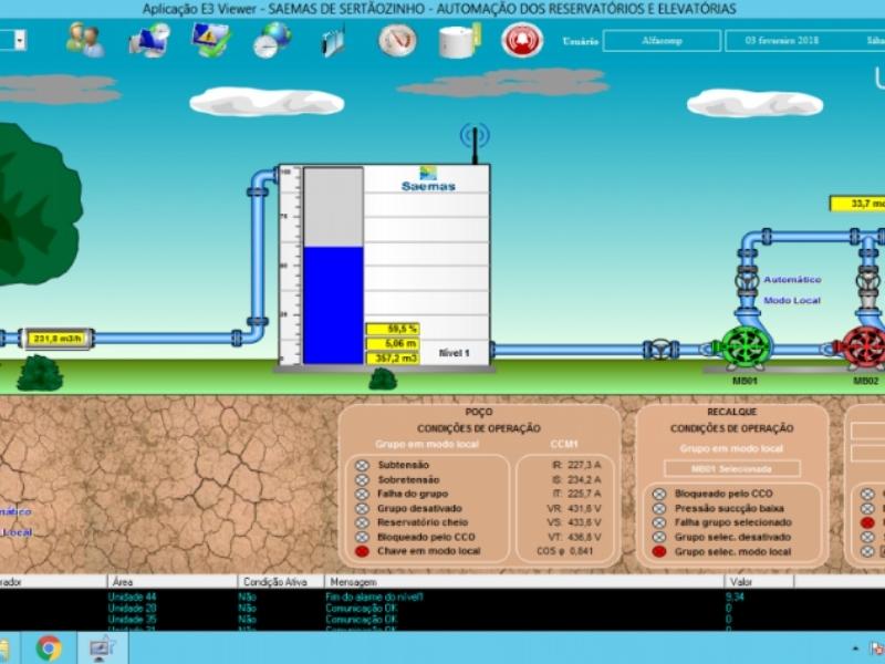 O E3 permite monitorar e executar comandos sobre as 20 unidades do sistema de abastecimento de água de Sertãozinho, cada uma delas composta de um reservatório e três moto bombas. Para isto, disponibiliza uma tela destinada a cada unidade, na qual é possível supervisionar as vazões, pressões, tensões e correntes assinaladas junto às moto bombas, assim como os níveis de água nos reservatórios.