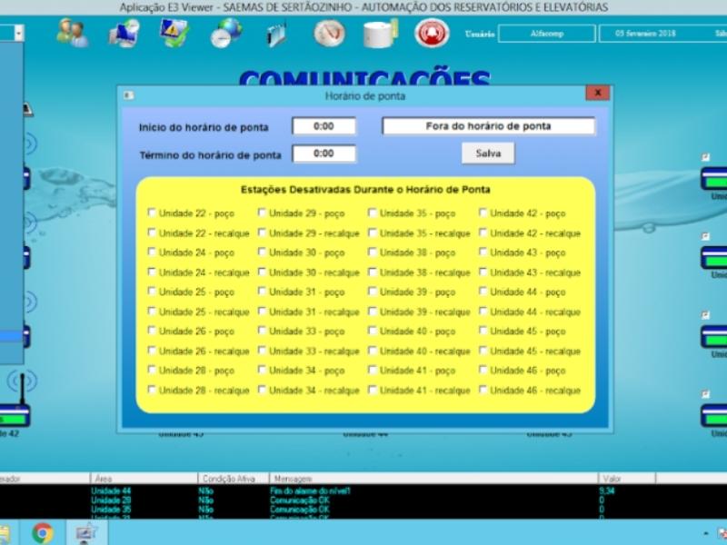 O mesmo controle vale para as configurações dos níveis de água nos reservatórios, as quais podem ser ajustadas de forma que o sistema ligue ou desligue as moto bombas conforme seja necessário, contribuindo assim para garantir o abastecimento e redução de desperdícios. Neste contexto voltado ao uso mais racional de água e energia, o E3 também permite selecionar quais estações entrarão em funcionamento nos horários de ponta conforme a demanda.